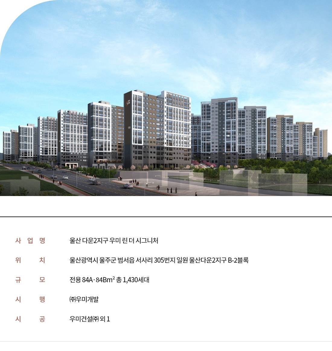 울산 다운2지구의 중심 입지 역사공원과 학교 부지를 품은 쾌적한 주거 환경 다운2지구 내에서도 핵심적인 B-4블록에 위치하며 단지 앞 역사공원(계획)과 근린생활시설 용지를 편리하게 이용합니다. 총 731세대, 최고 25층 대단지 울산 중구의 스카이라인을 바꾸는 웅장한 스케일 지상 최고 25층, 총 731세대로 조성되어 넉넉한 동간 거리와 함께 지역을 대표하는 주거 상징성을 갖춥니다. 울산외곽순환도로 착공 등 교통 호재 울산 도심 및 광역 지역 연결이 획기적으로 개선 울산외곽순환도로 착공 및 국도 신설 등 대규모 광역 교통망 확충 사업의 직접적인 수혜를 입을 전망입니다. 스카이라운지 및 게스트하우스 도입 울산에서 보기 드문 최고급 수준의 특화 커뮤니티 스카이라운지, 게스트하우스는 물론 실내체육관, 골프연습장 등 입주민의 자부심을 높이는 차별화된 고급 시설을 선보입니다. 유치원, 초·중·고 부지 인접 학세권 단지 가까이 안심하고 통학 가능한 교육 환경 단지 인근에 유치원, 초·중·고교 부지가 계획되어 있어 자녀의 안전한 교육과 생활 편의를 모두 만족시킵니다. 84㎡ 단일 면적의 혁신 평면 4Bay 맞통풍 구조와 알파룸 설계로 공간 활용 극대화 가장 선호도가 높은 84㎡ 단일 면적에 남향 위주 배치와 우미린만의 혁신적인 설계를 적용했습니다. 산업단지 직주근접 배후 수요 다운혁신융합지구 및 성안·약사 산단 인근 다운혁신융합지구와 성안·약사 일반산업단지 등과 가까워 풍부한 주거 수요를 기반으로 높은 미래 가치를 기대할 수 있습니다.